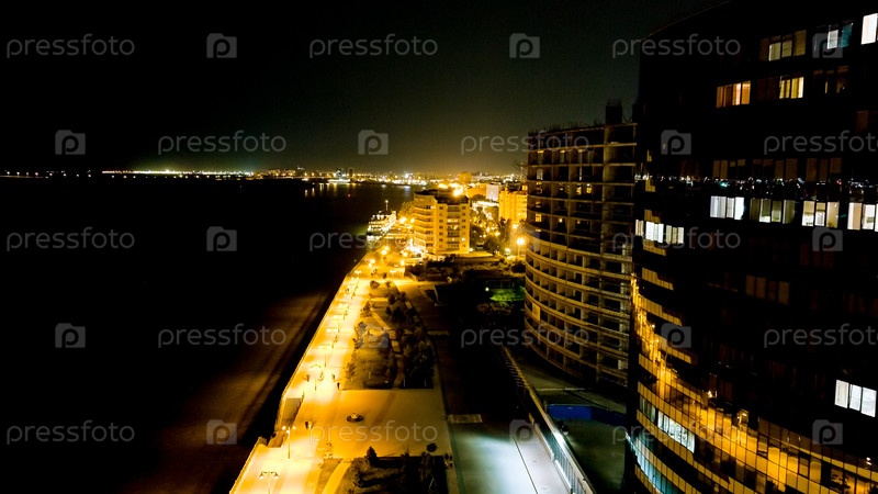 Астрахань, Россия. Волга, Петровский набережной. Городские ночные огни, вид с воздуха