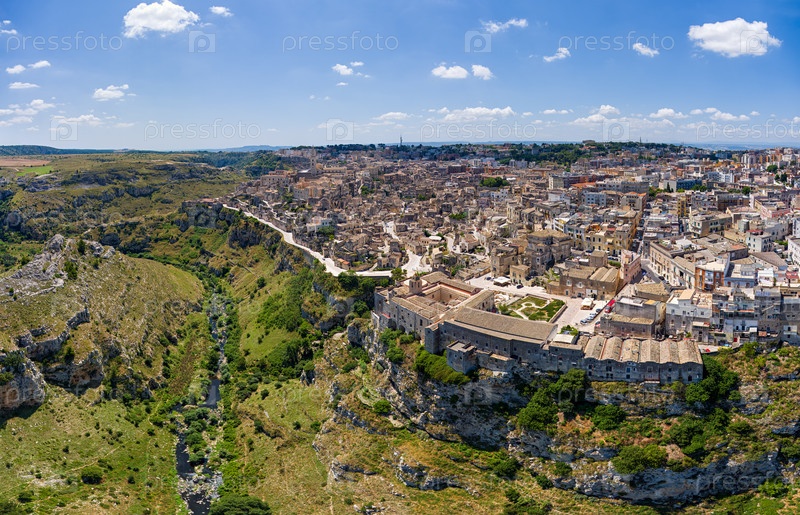 Матера, Италия - город в итальянском регионе Базиликата, административный центр провинции Матера.Старая часть города высечена из скалы и является объектом ЮНЕСКО.Вид с воздуха