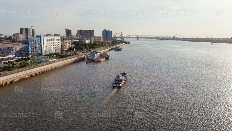Астрахань, Россия Судно плывет по Волге Лето, вид с воздуха
