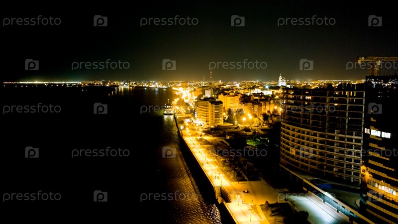 Астрахань, Россия. Волга, Петровский набережной. Городские ночные огни, вид с воздуха