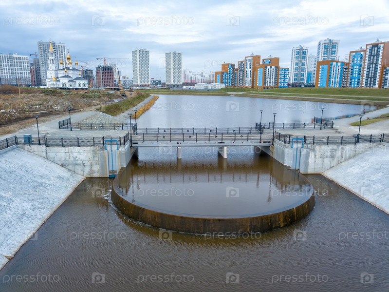Екатеринбург, Россия. плотина на реке в районе с новыми и строящимися домами