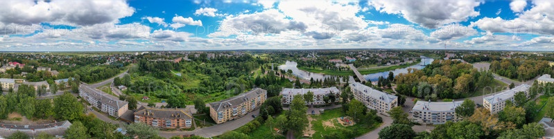 Ржев, Россия. 360-градусная панорама в центре города. Вид с воздуха на Волгу и набережные