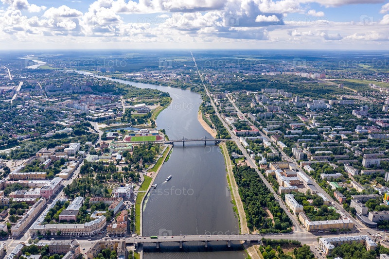 Россия, Тверь. река Волга. панорама с воздуха. мостик Староволжский и мост Нововолжский