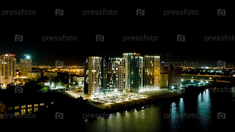 Астрахань, Россия Новый жилой комплекс на берегу реки Волги Городские ночные огни, вид с воздуха