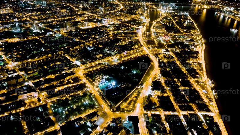 Астрахань, Россия. вид на астраханский Кремль. Ночной город, взгляд с воздуха