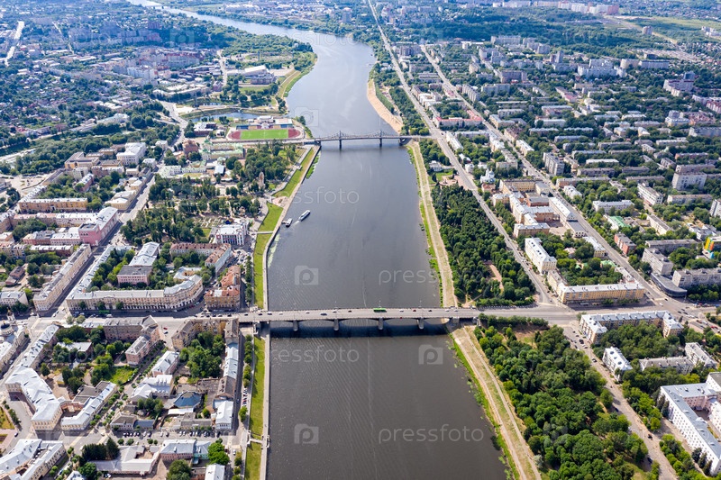Россия, Тверь. река Волга. панорама с воздуха. мостик Староволжский и мост Нововолжский