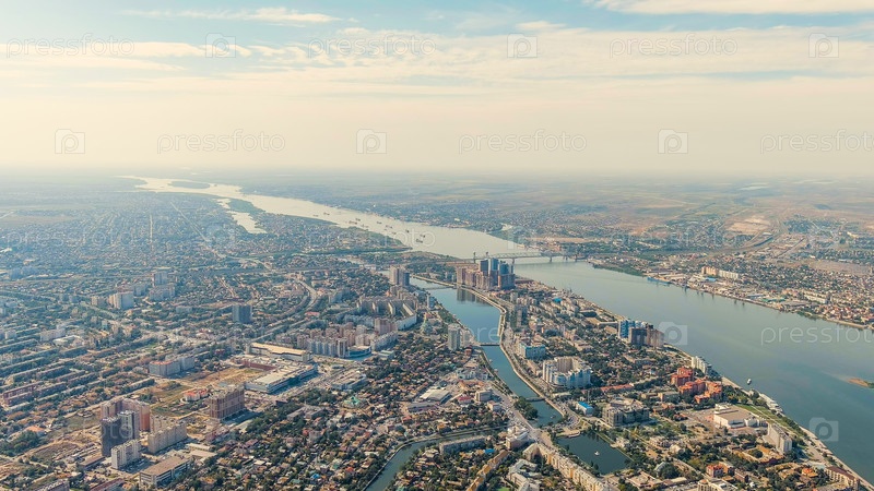 Река Волга и набережная города Астрахань, взгляд с воздуха