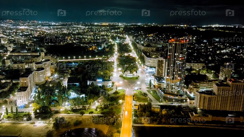 Саратов, Россия. Славянская площадь. Текст переводится как 'Саратов'. Панорама ночного города, вид с воздуха