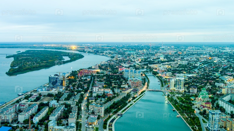 Астрахань, Россия.Панорама города в сумерках.Городские огни ночью.Вид с воздуха
