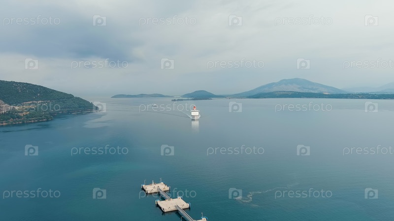 Большой паром входит в порт, вид с воздуха