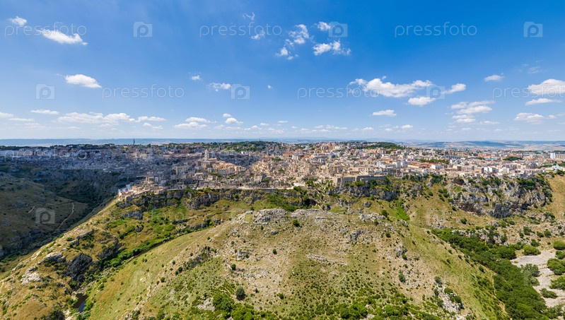 Матера, Италия - город в итальянском регионе Базиликата, административный центр провинции Матера.Старая часть города высечена из скалы и является объектом ЮНЕСКО.Вид с воздуха