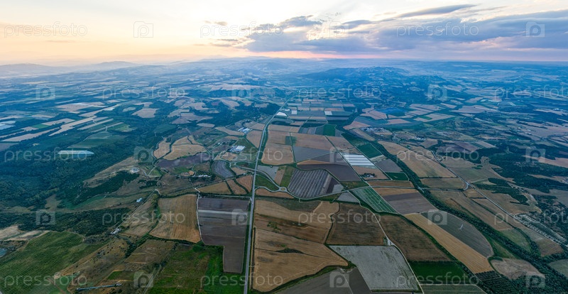 Джиноза, Италия Геометрический рисунок сельскохозяйственных полей Время захода солнца Вид с воздуха