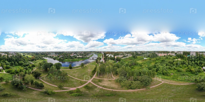 Ржев, Россия. 360-градусная панорама в центре города. Вид с воздуха на Волгу и набережные