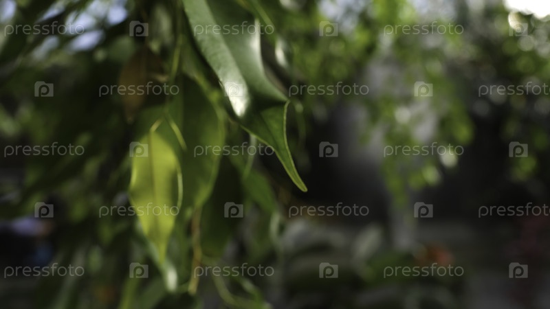 Зелёные сочные листья вытянуты, освещены солнечным светом на фоне другой зеленой растительности