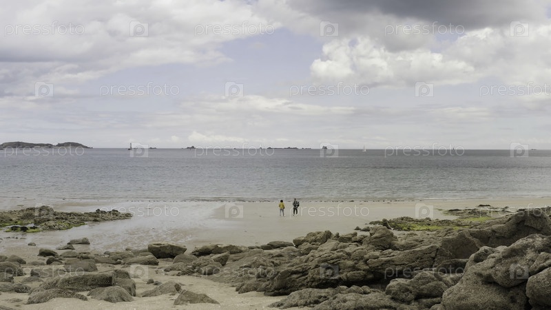 Пара гуляет вдоль пляжа с скалистым берегом с спокойным морем и голубым облачным небом на заднем плане