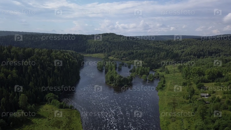 Большой летний пруд и лес вокруг него, большие зеленые деревья с голубым небом над головой