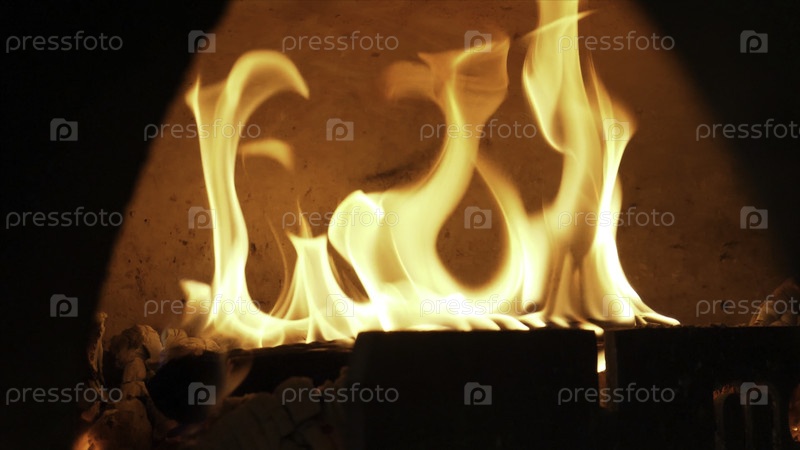 Закрытие пламени огня, горящего в духовке. Рамка. Пламя огня идеально горит в традиционной древесной плите. Огонь в кулинарной печи