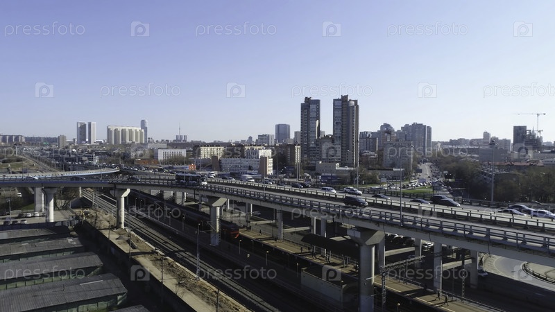 Вид на большой город с многоэтажными зданиями и трафиком на дорогах. Сцена. Красивый мегаполис днем погружается в шумный транспорт на дорогах города