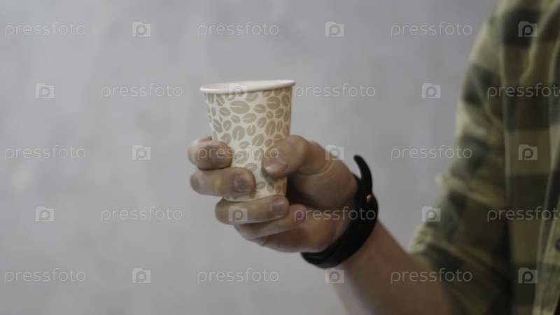 Человек, держащий белую чашку, затем превратил ее в бумажную кофеварку.Человек держит коричневую бутылку из бумаги.Мужчина с пустой чашкой закрывается