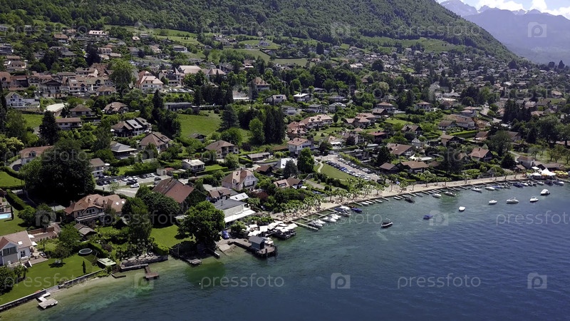Вид на райское место отдыха в сельском городке в лесистом районе с прибрежными горами на бирюзовом озере летом