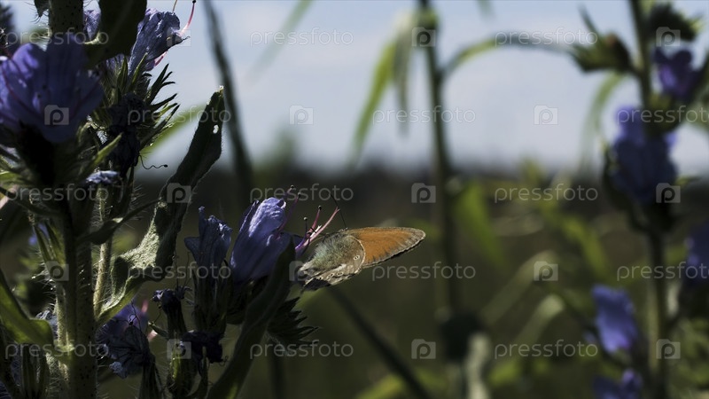 Шкала бабочки на голубых цветах в поле творческая солнечный день в поле с жизнью бабочки спокойная бабочка на синем цвете