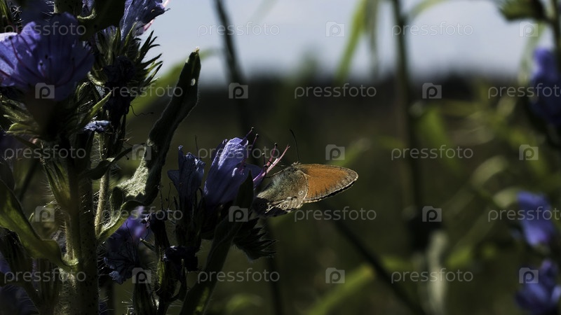Закройте маленькую бабочку, сидящую на цветочном бутоне.Креативно.Летний пейзаж с зеленой и цветковой лужайкой и небольшим насекомым, сидящим на цвете