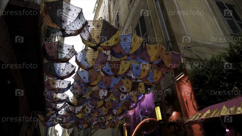 Есть цветные зонтики. идите вперед. вид на старые зонты, висящие на улице города. висячие зонты украшают улицы старого гордости