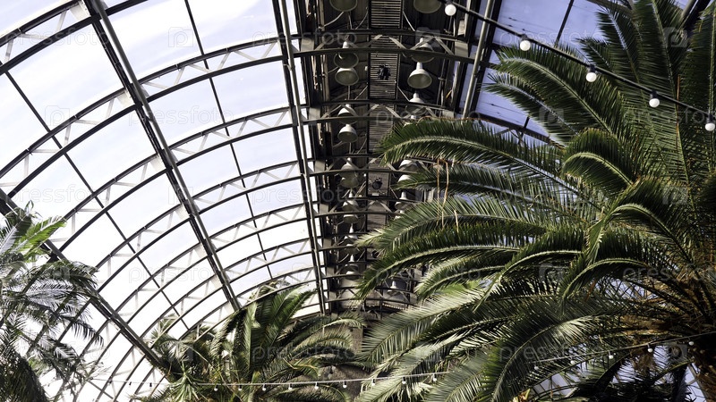 Теплица с пальмами. солнечные лучи освещают пальмовые ветви, отдыхающие на стеклянной крыше зимнего сада. экзотические растения и деревья в теплицах