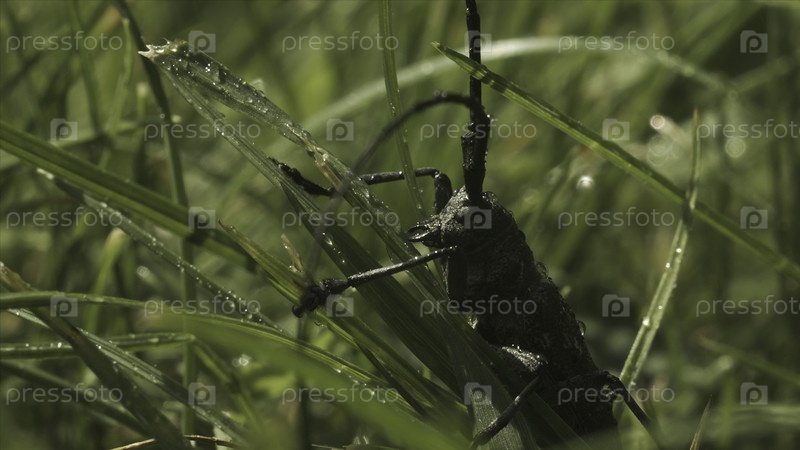 Большая саранча в траве. креативность. большой черный жук на траве во время дождя. жук или саранча сидит на траве под дождём. макрокосмос летнего луга