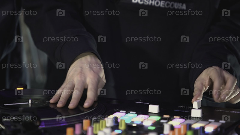 Диджей держит консоль в руках. Искусство. Диджей играет на музыкальном наборе. Парень играет левой рукой на звуковой платформе диджея-консоли