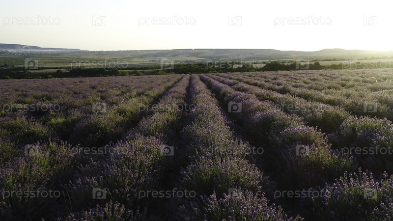 Вид с воздуха цветущего лавандового поля летом вечером, красота природы. стрельба. фиолетовые цветы лаванды растут на поле в прямых болотах