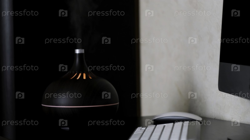 Увлажнитель, распространяющий пар в доме, детали современного интерьера квартиры.Концепция.Ультразвуковый увлажнитель стоит на столе рядом с компьютером и клавиатурой