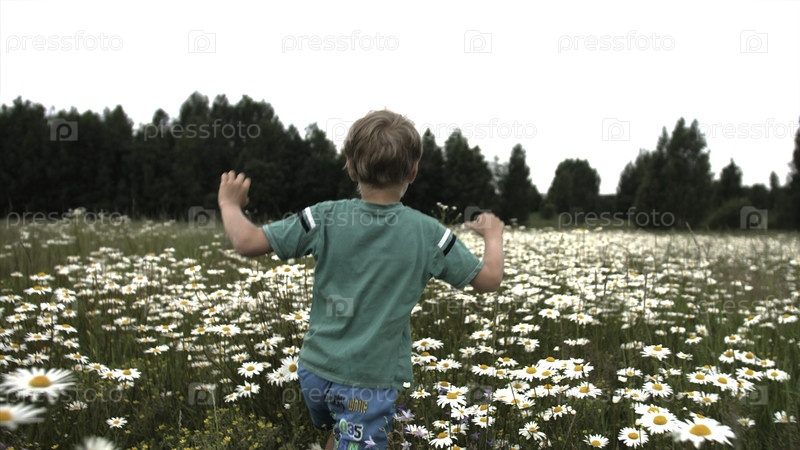 Концепция детства и свободы, мальчик бежит на цветущем лугу. творческий. задний вид маленького мальчика, бегающего по поле ромашки в солнечный летний день