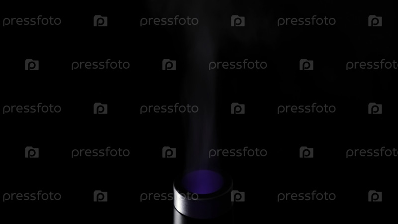 Пары из ультразвукового увлажнителя выделены на черном фоне. Концепция. Здравоохранение, изменение климата, экстремальная конвергенция сопла увлажнителя воздуха