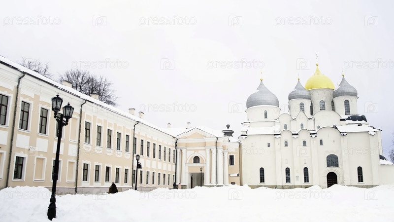 Софийский собор и архитектурный ансамбль, Великий Новгород, Россия в солнечный холодный зимний день. Концепция. Историческое место с большим храмом