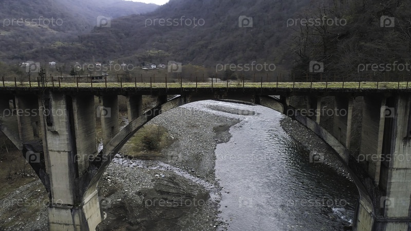 Полет к древнему бетонному мосту, покрытому зеленым мхом.Воздух сельского ландшафта с небольшой деревней, расположенной в холмистом районе