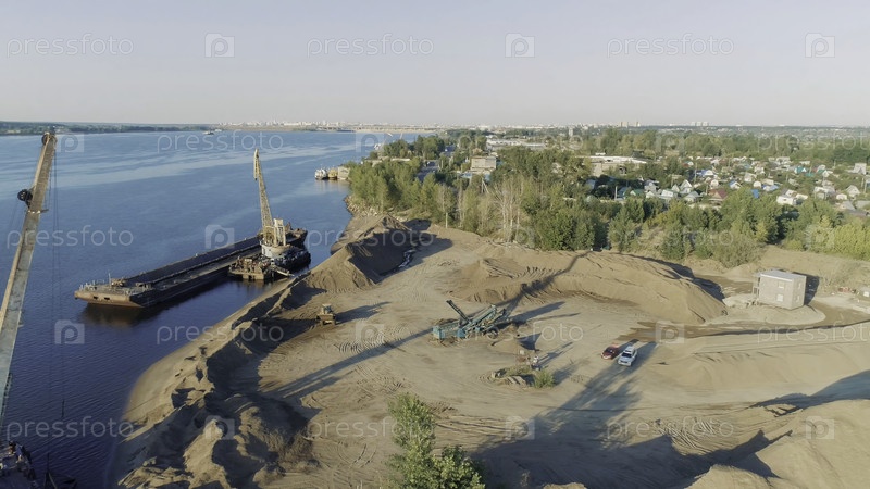 Строительные краны и грузовики на берегу. Сцена. Вид сверху на очистку строительной площадки на берегу озера. Начало строительства на озере в солнечный день