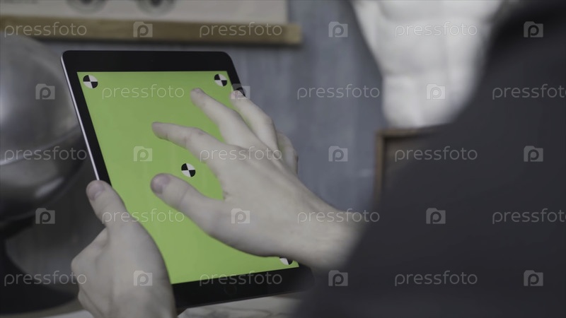 Руки неизвестного молодого человека касались и прокручивали по ноутбуку с зеленым экраном на деревянном столе рядом со серебряным глобусом