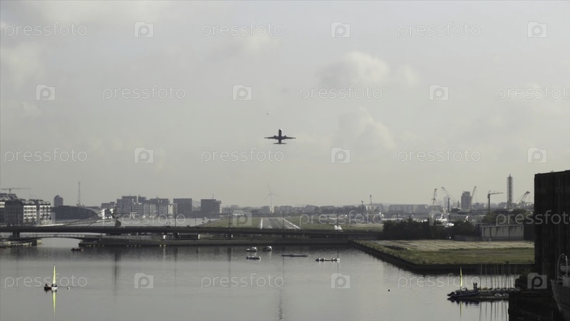 Самолет пролетает над городом, мостом и широкой рекой на фоне облачного неба