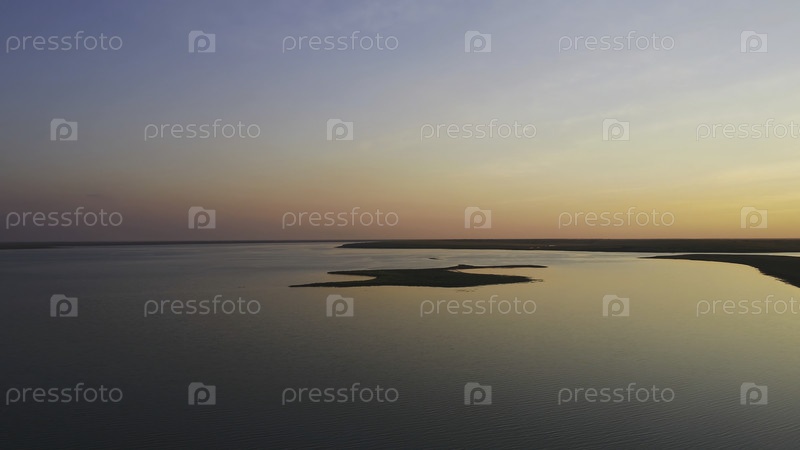 Стадо птиц против красочного неба.Закат на реке.Остров чайки.Птицы летают при закате, из воздуха