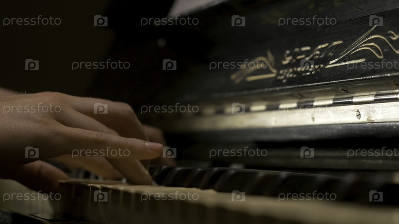 Молодая женщина играет на фортепиано в ближайшем плане Пианист-руковой пианист играет на музыкальных инструментах детально с ручным игроком вблизи