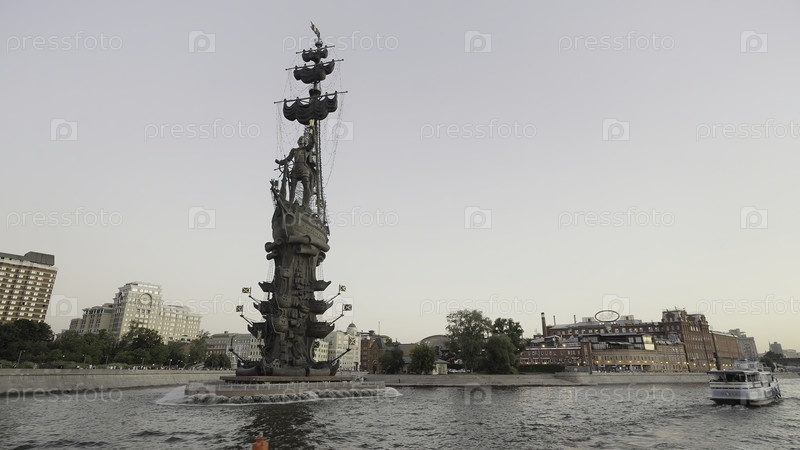 Бронзовая скульптура на гранитном пьедестале, расположенном на Петровской площади в Воронеже.Продолжайте.Пейзаж, захваченный во время плавания по реке рядом с небольшим кораблем за домом и красивыми туманными облаками