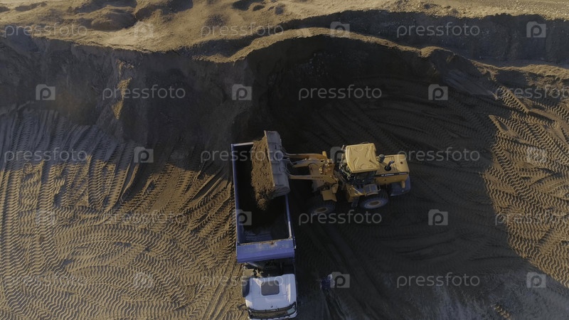 Вид сверху экскаватора со сварочным грузовиком на карьере Сцена. Экскаватор заполняет сварочный грузовик в карьере землей. Ограбление большой площади для строительства