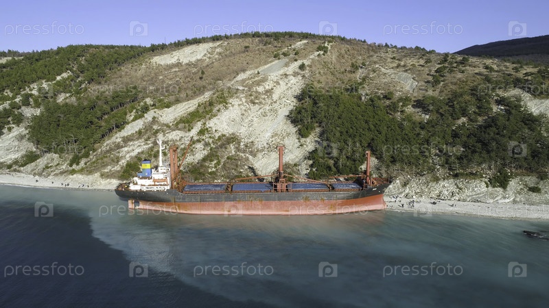 Вид с высоты пустой красной баржи, пришвартованной недалеко от красивого голубого берега моря