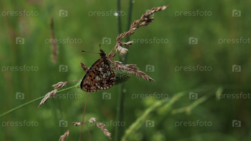 Бабочка в макрофотографии.Креативность.Яркая бабочка с красными крыльями сидит на сухой ветке зеленой травы, и небольшой дождь капает на нее