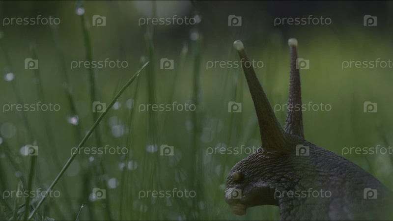 Большая улитка в траве с росой. креативное. крупный план красивой улитки на фоне зеленой травы. виноградная улитка ползает по траве после дождя