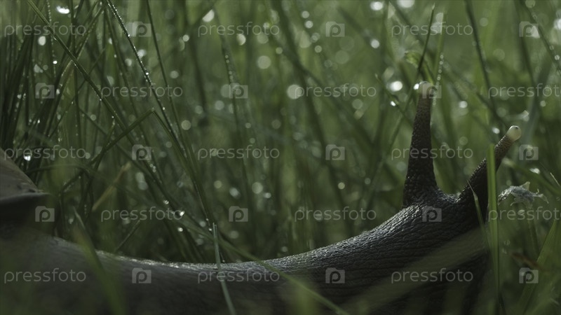 Закройте виноградную улитку в траве.Креативно.Большая улитка в траве с росой после дождя.Прекрасная виноградная улитка в зеленой траве.Макрокосмос на летнем лугу