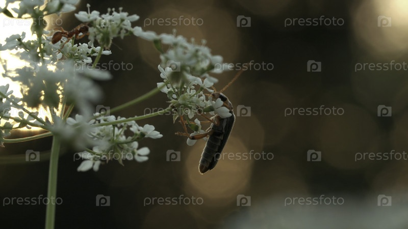 Покрыть муравья или жука на белом луговом цвете на размытом фоне.Креативно.Небольшое насекомое в летнем поле, макровизия