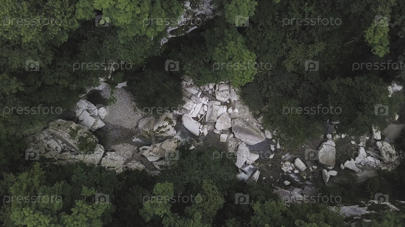 Вид с воздуха горной реки, протекающей через зеленый лес. Клип. Природный пейзаж с течением холодной пресной воды и большими камнями среди деревьев