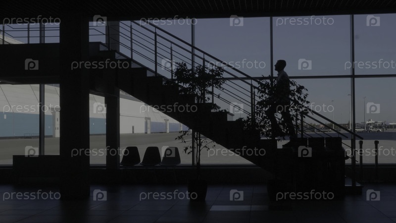 Небо закатывается за окнами бизнес-центра. HDR. Люди ходят в бизнес-центр или торговый центр с интерьером, украшенным растениями и лестницей
